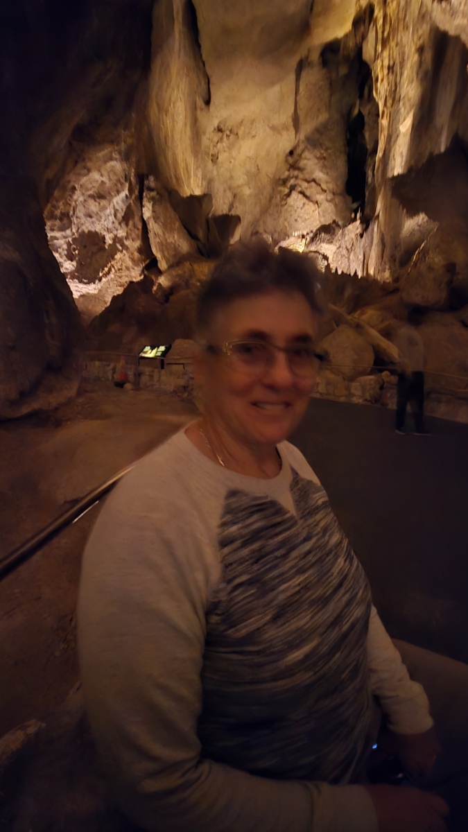 You have to get timed-entry tickets ahead of time, and ours got us in right when the park opened. We had a great parking space near the door, and we spent a bunch of time in the gift shop. Our plan was to do the long walk through the caverns. We went down through the Natural Entrance. The caverns have an elevator to take you down, or you can walk downhill for a long way to get in through the actual cavern entrance. We were so glad we went that way, and very happy we wore the right shoes. You're walking downhill for a long time.