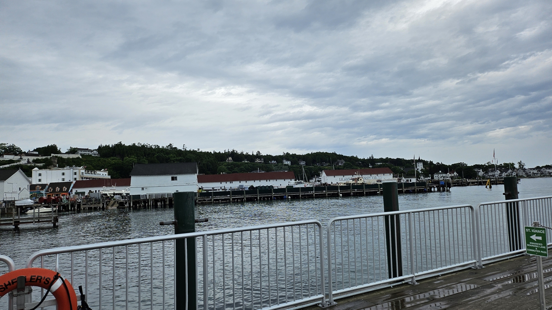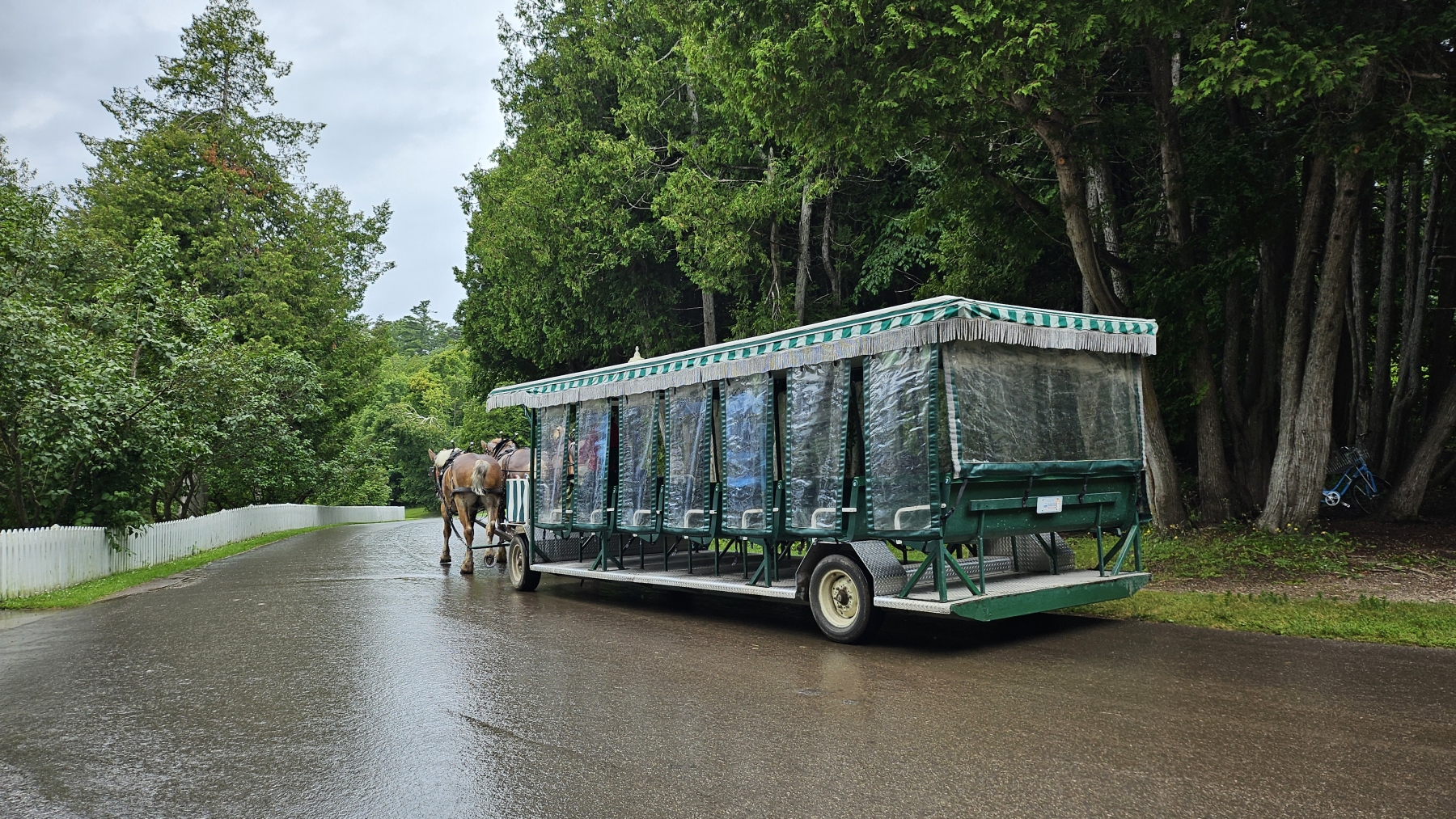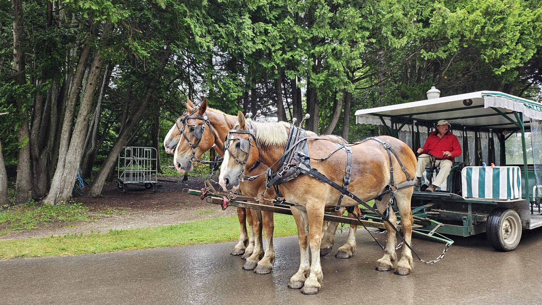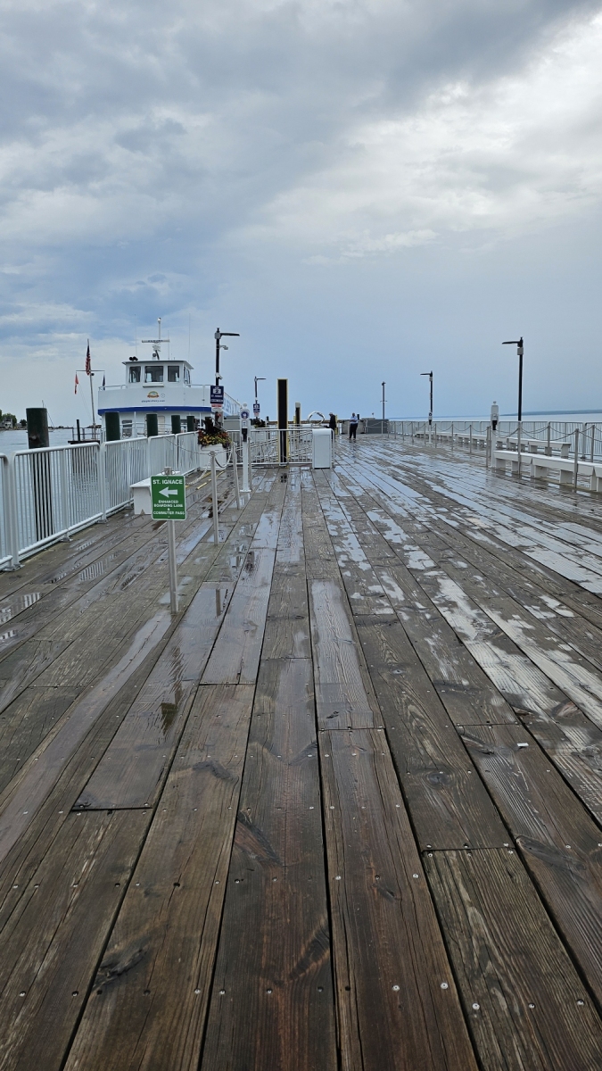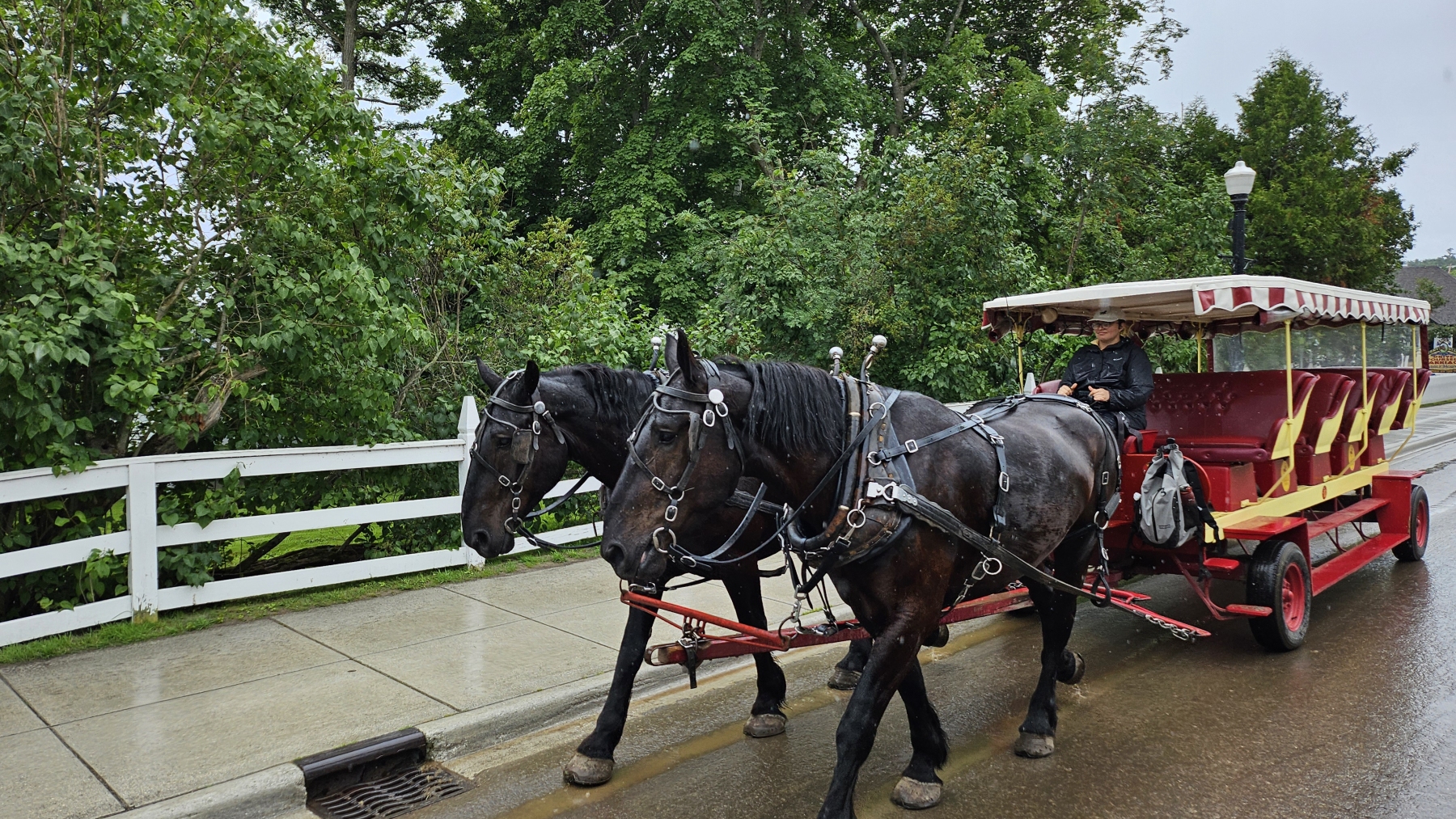 After a wonderful second week at our campground, we finally got to go to Mackinac Island. The campground offered a free shuttle to the dock, which was nice. But it was going to be a rainy day. We were ready and bundled up as we got onto the ferry. We took lots of photos and were the last ones off the dock.