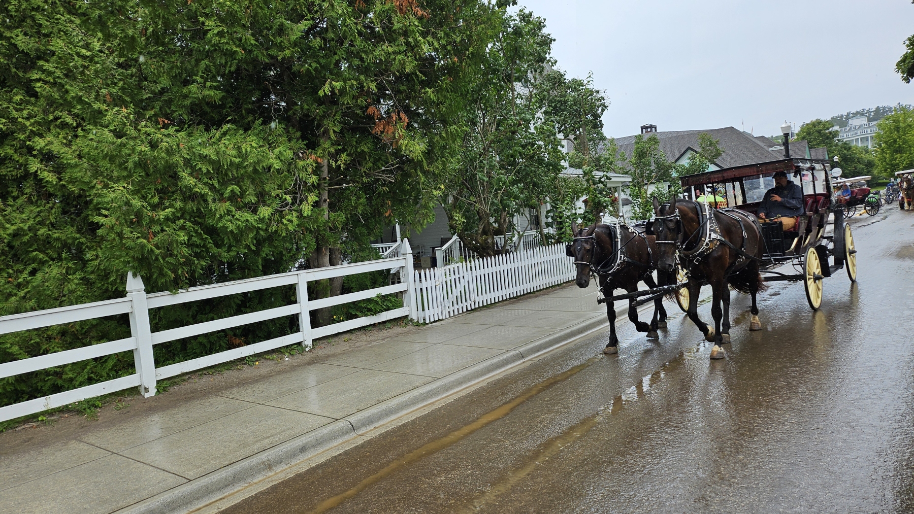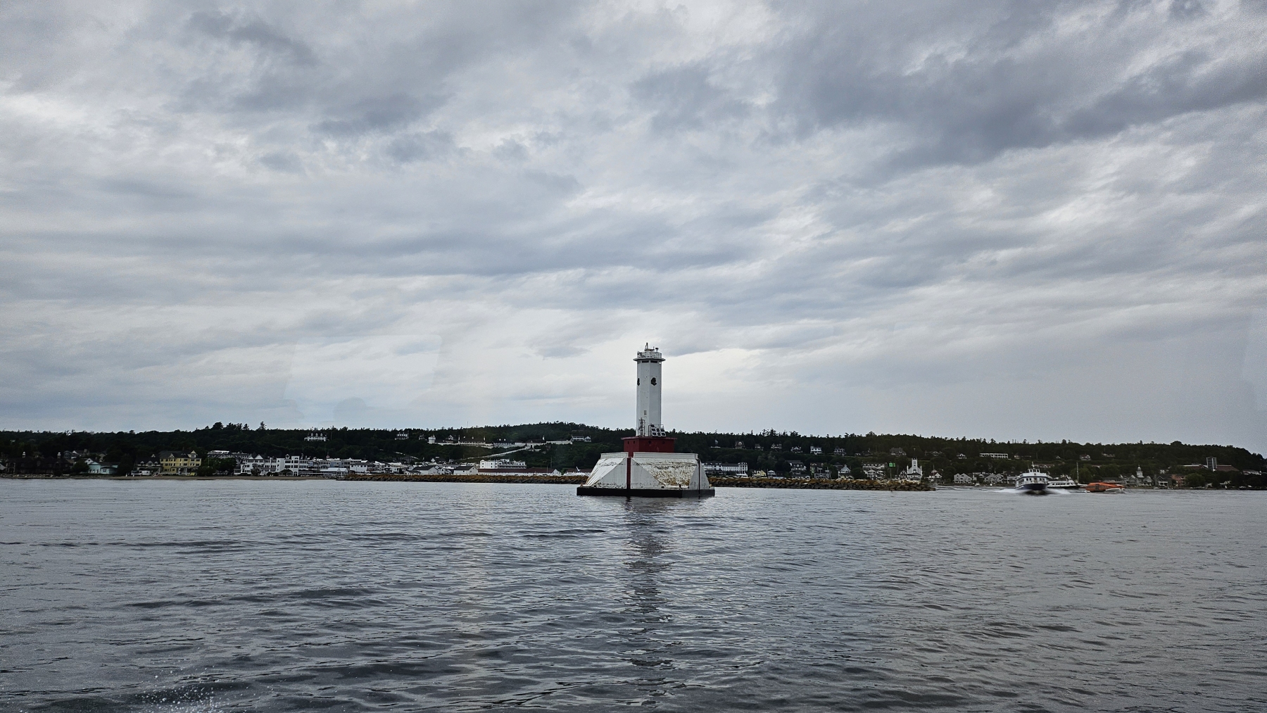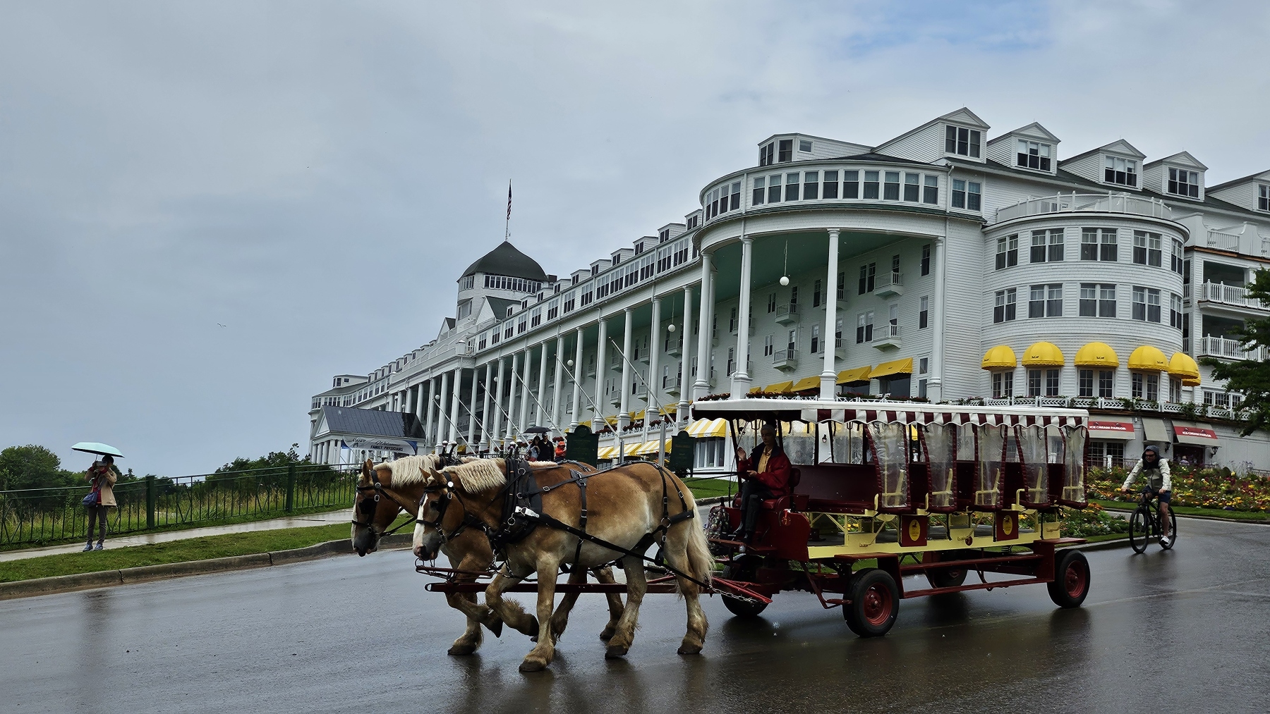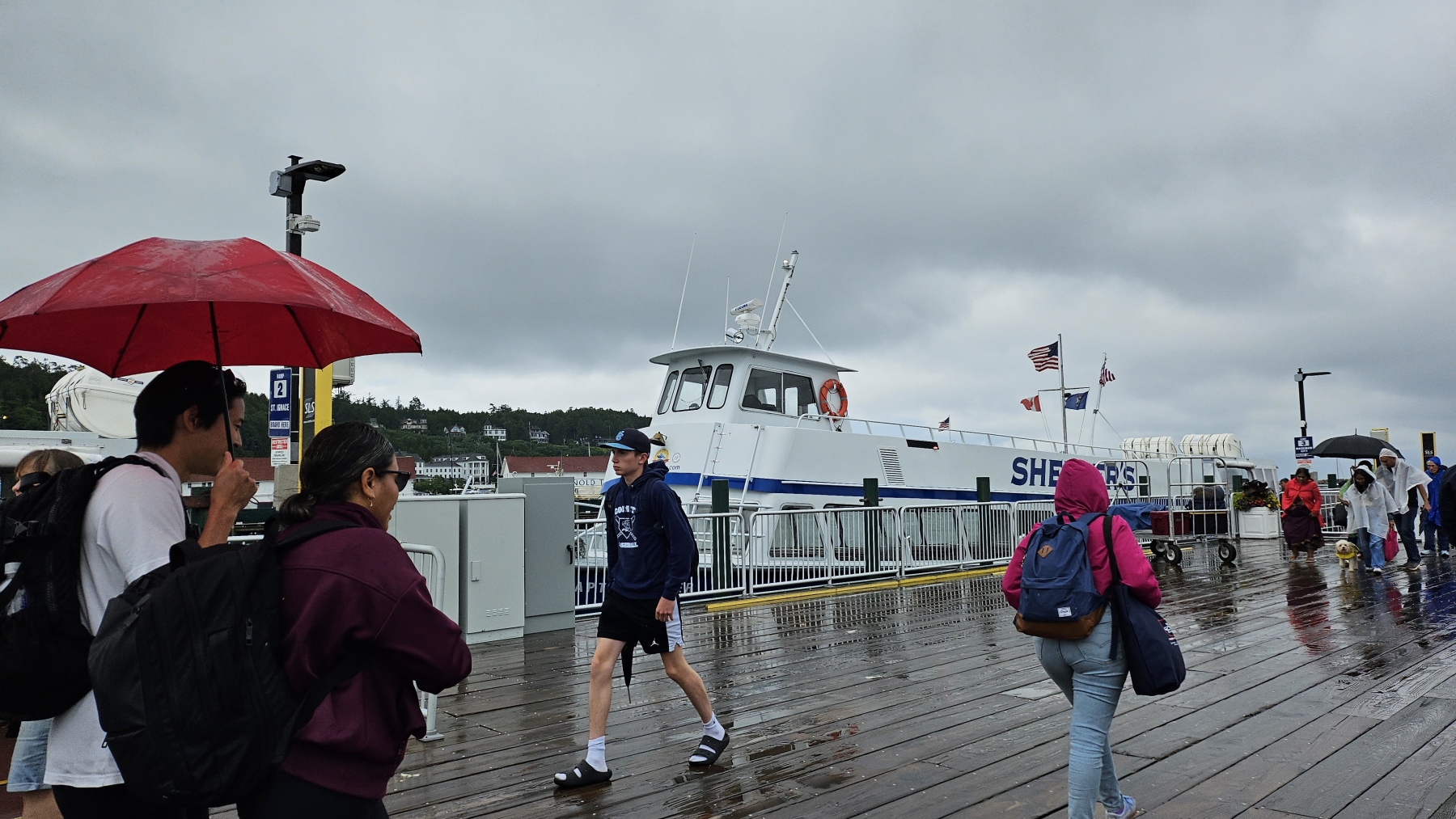 After a wonderful second week at our campground, we finally got to go to Mackinac Island. The campground offered a free shuttle to the dock, which was nice. But it was going to be a rainy day. We were ready and bundled up as we got onto the ferry. We took lots of photos and were the last ones off the dock.
