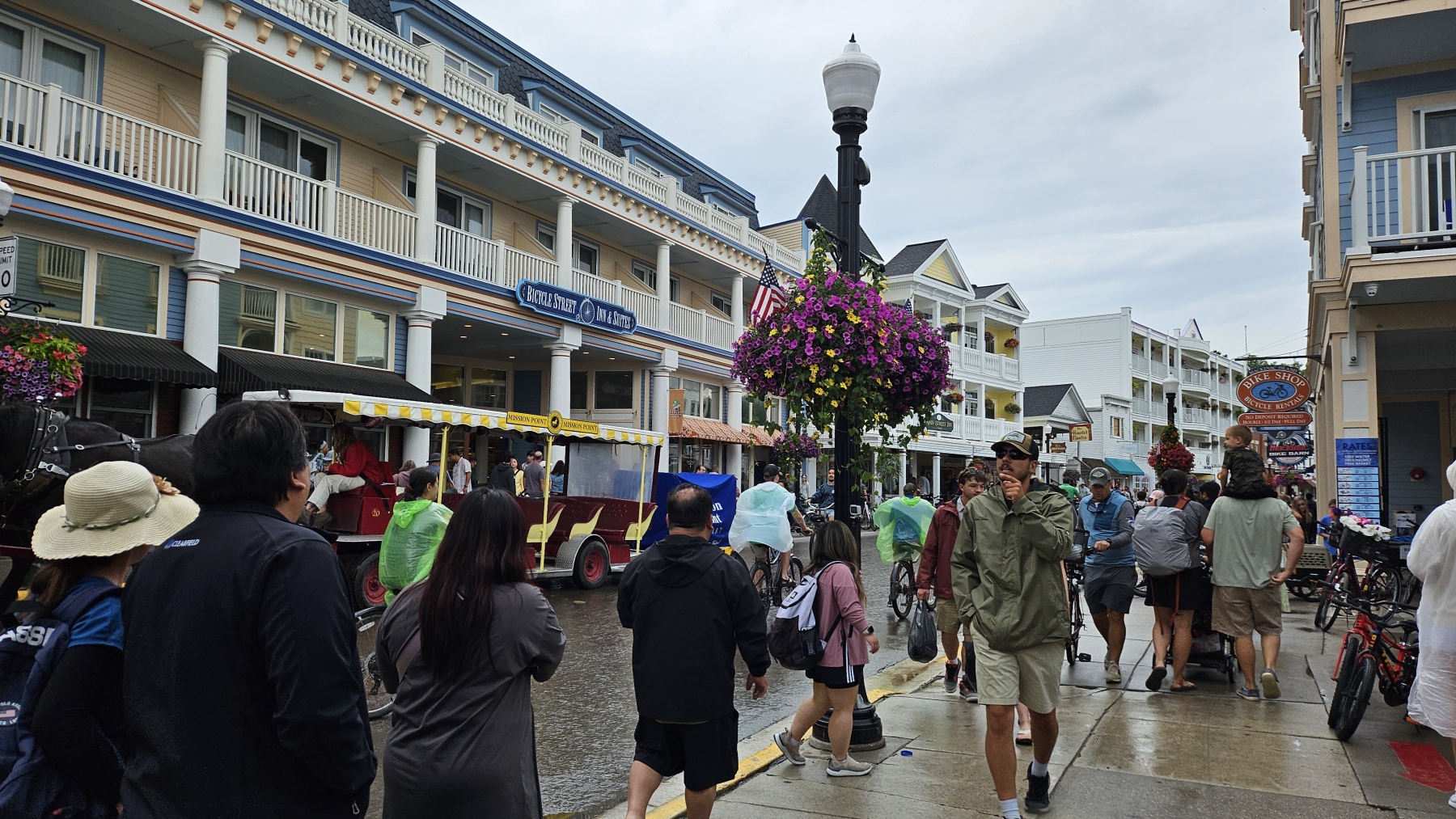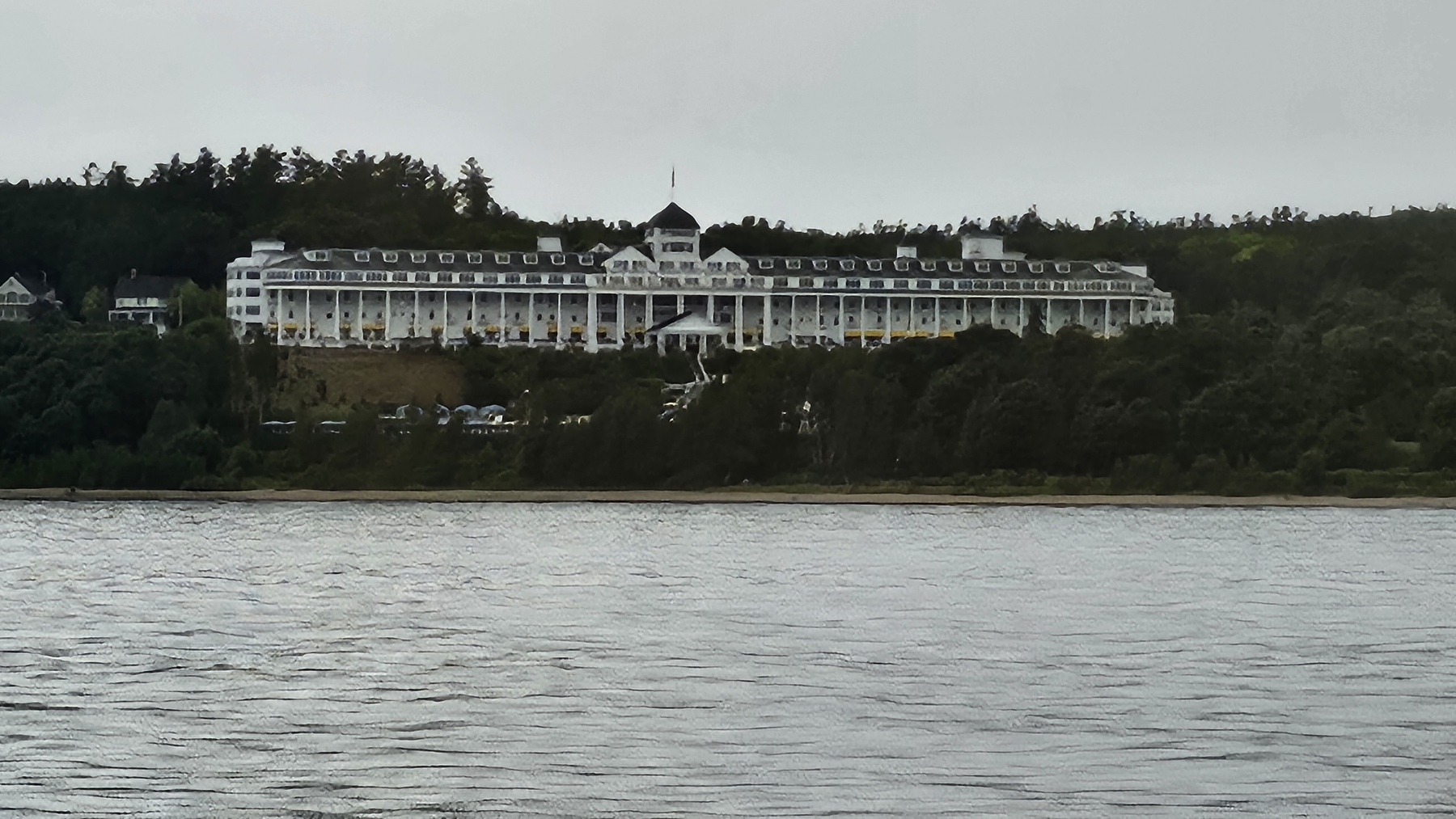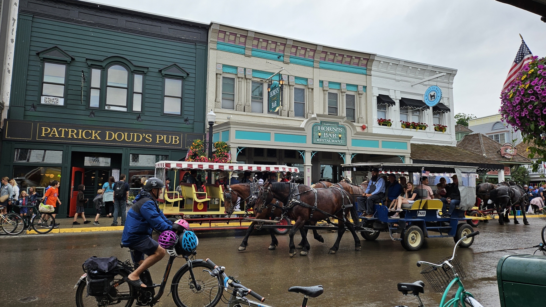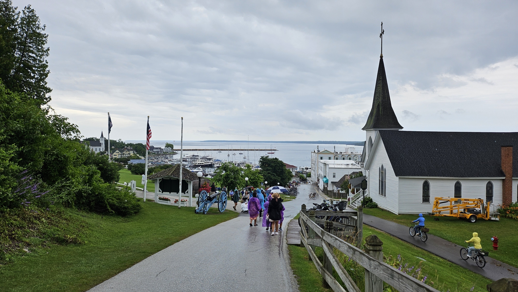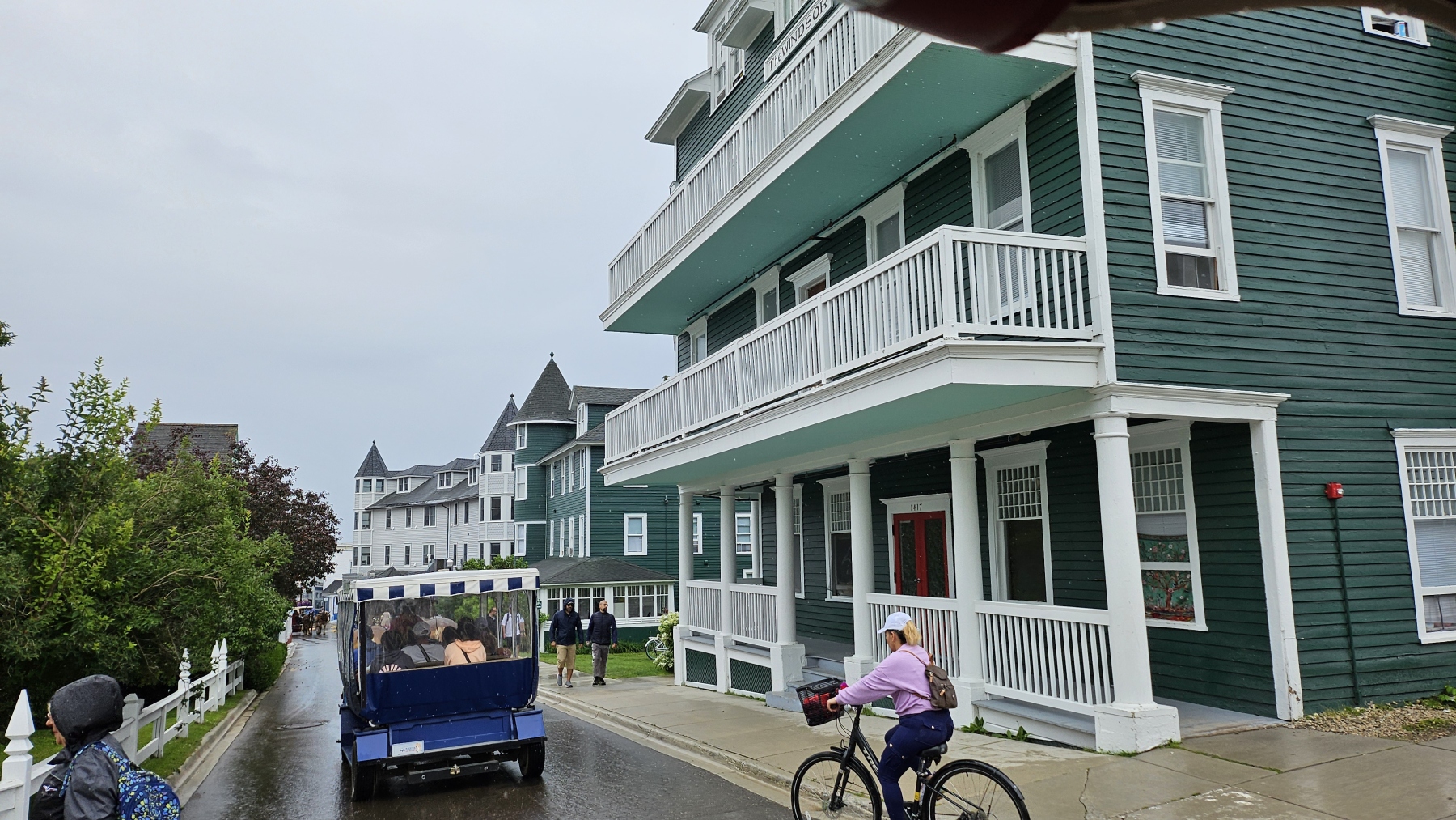 After a wonderful second week at our campground, we finally got to go to Mackinac Island. The campground offered a free shuttle to the dock, which was nice. But it was going to be a rainy day. We were ready and bundled up as we got onto the ferry. We took lots of photos and were the last ones off the dock.