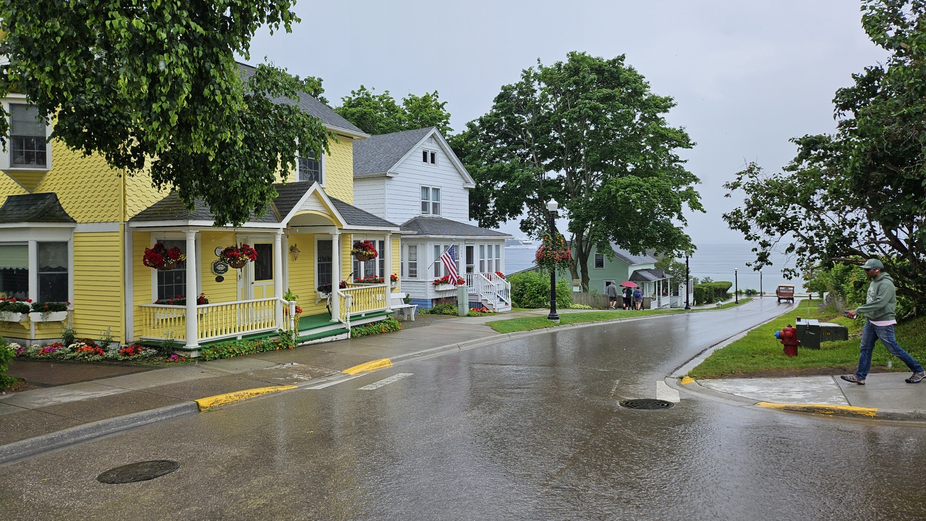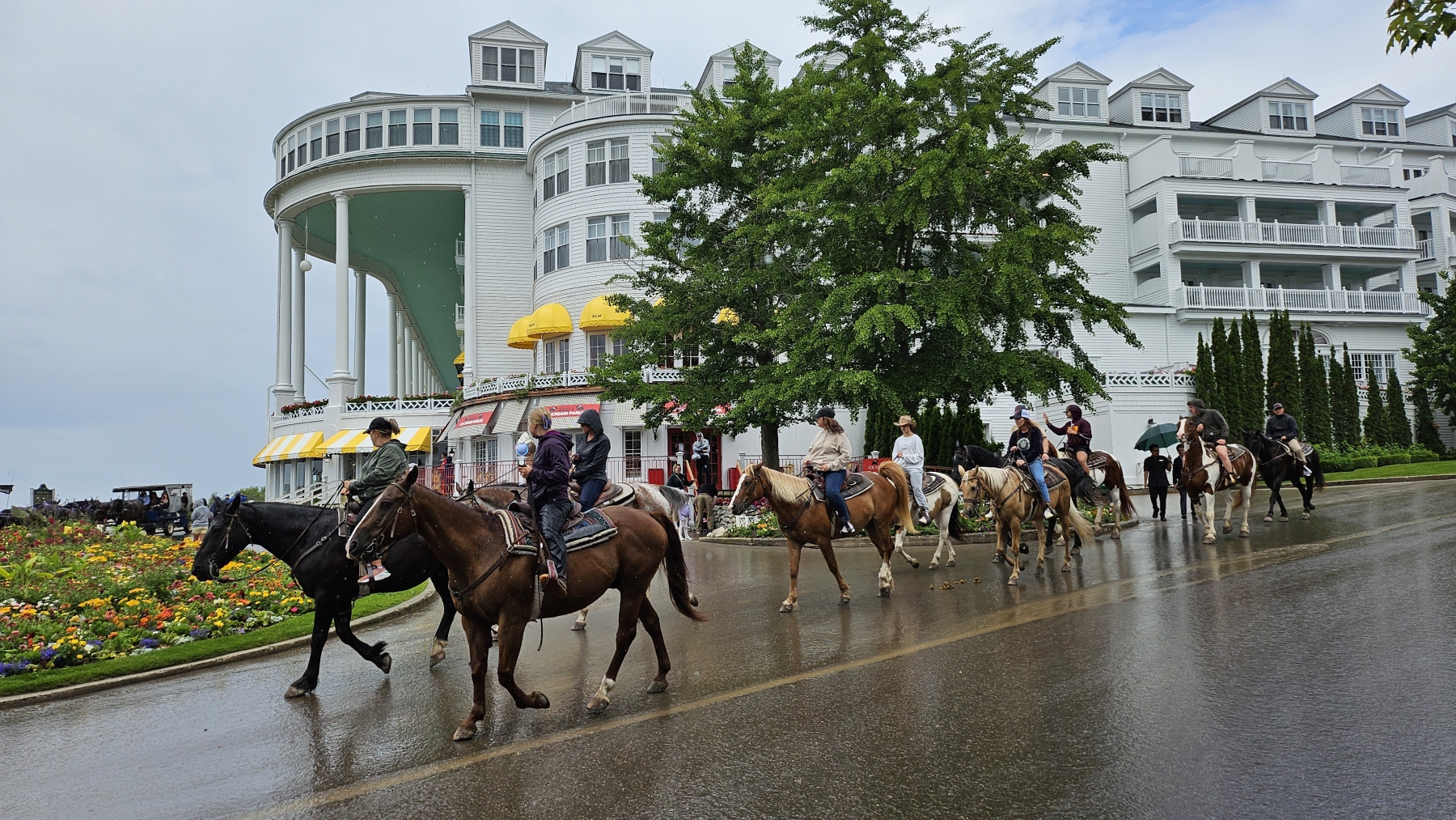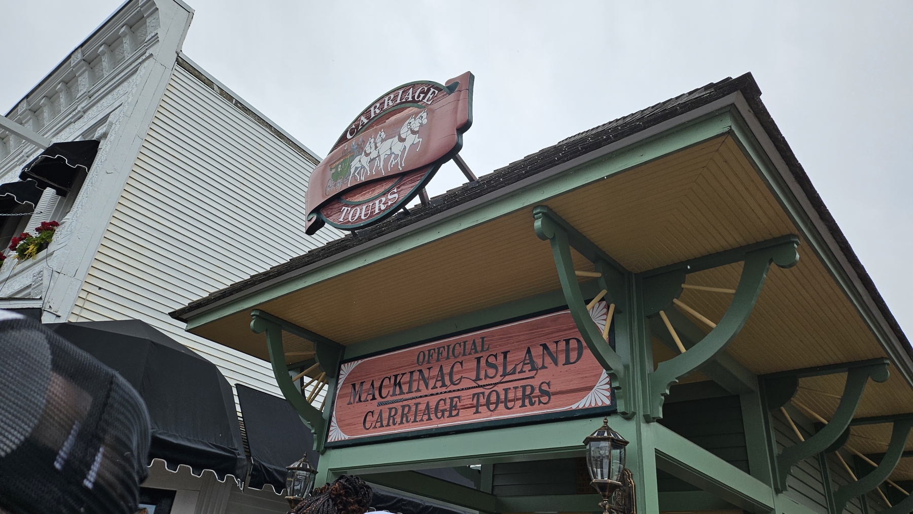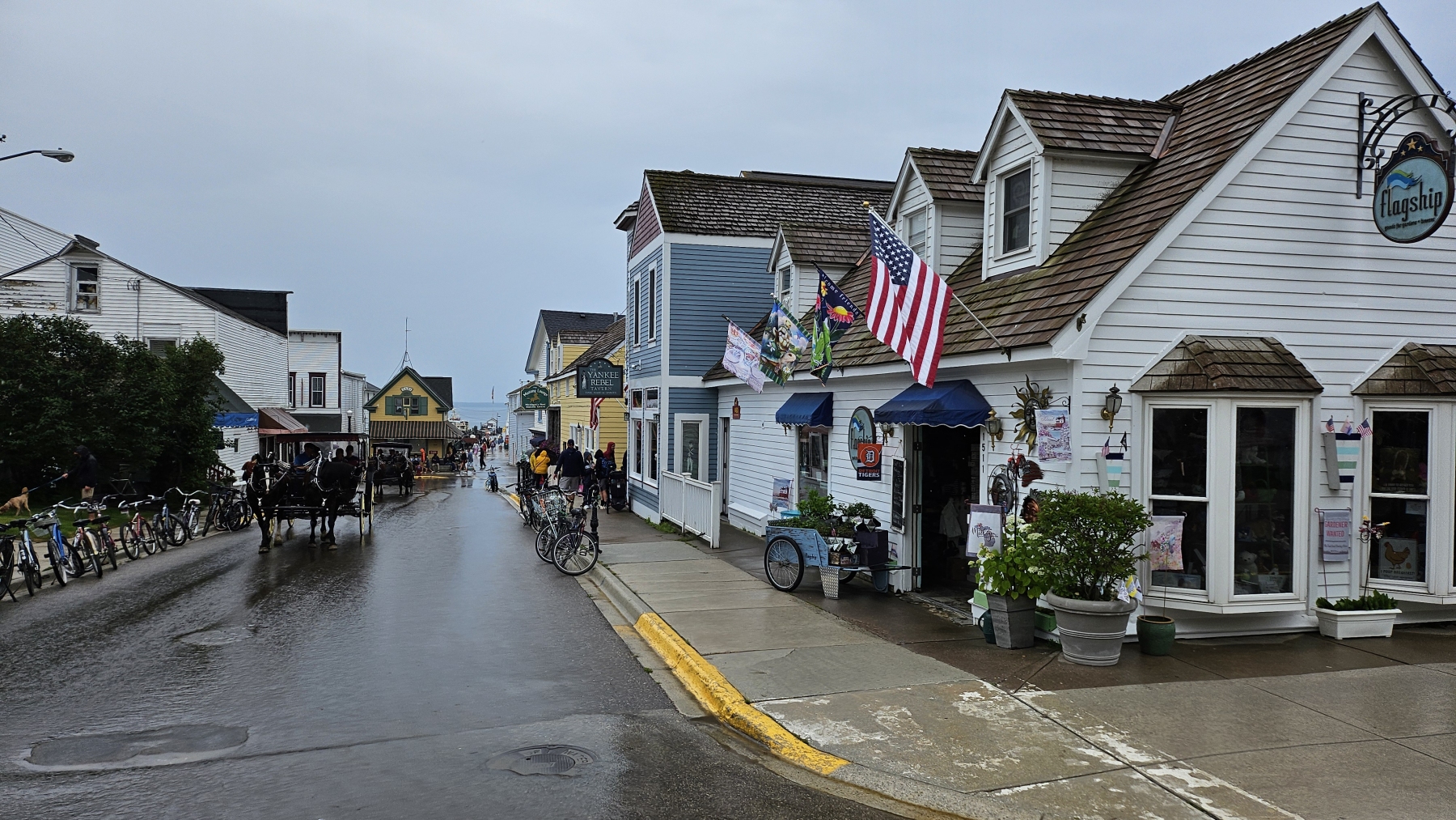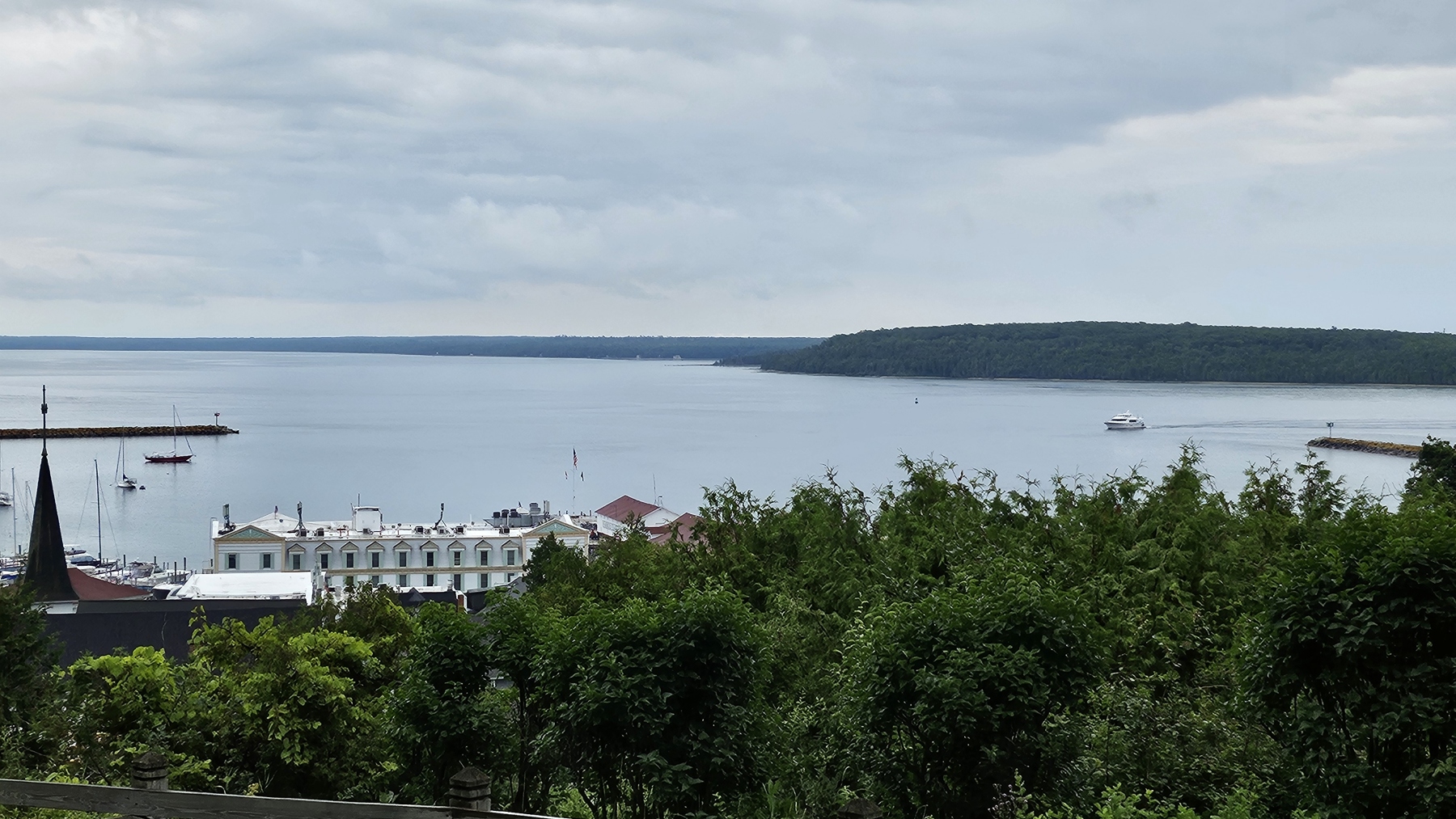 After a wonderful second week at our campground, we finally got to go to Mackinac Island. The campground offered a free shuttle to the dock, which was nice. But it was going to be a rainy day. We were ready and bundled up as we got onto the ferry. We took lots of photos and were the last ones off the dock.