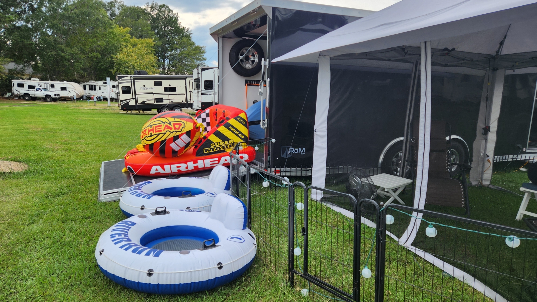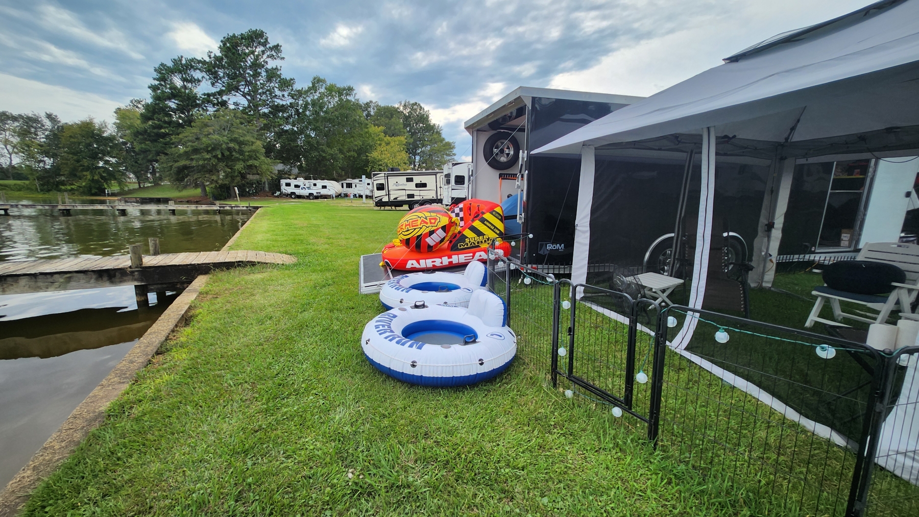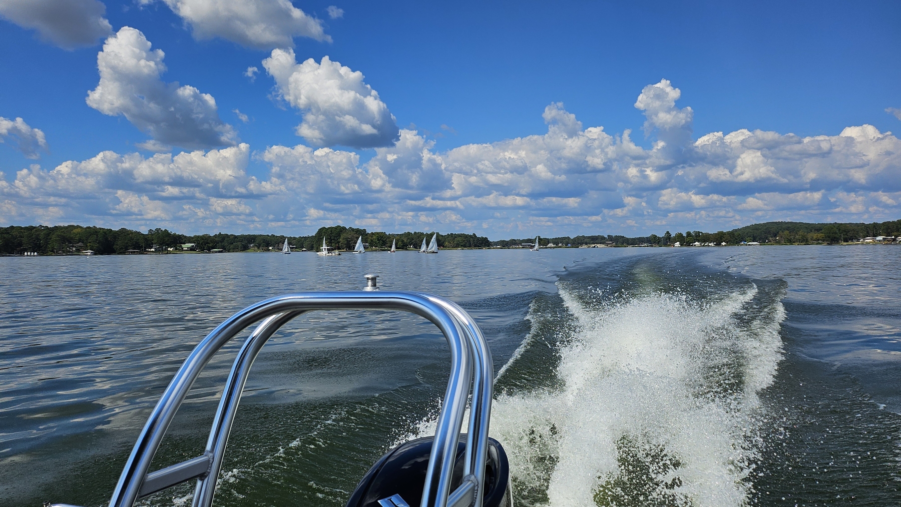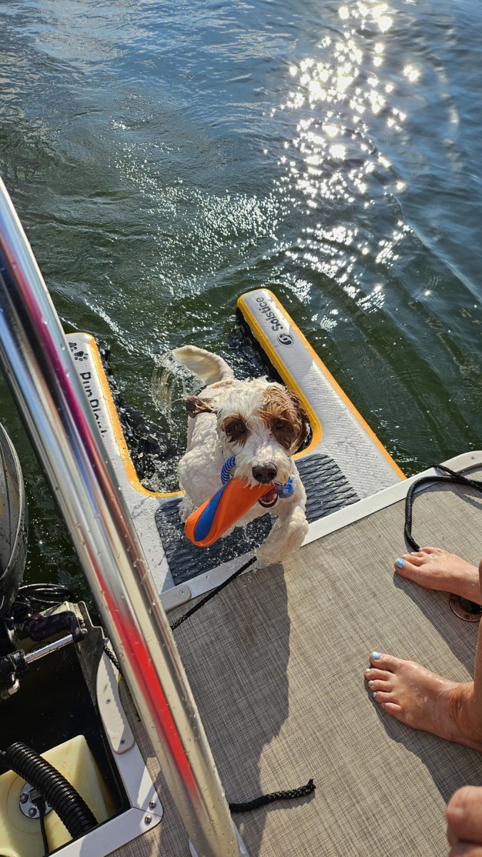 We went out on Friday with mom just tooling around the water and enjoying our time. Lacey jumped in the water a bit, and we were laughing. Then, on Saturday, Heidi and her family came to Cropwell to grill some burgers and salmon and go boating. We have a Super Mable, and we towed kids and adults around on it. It was a great time, with perfect weather.