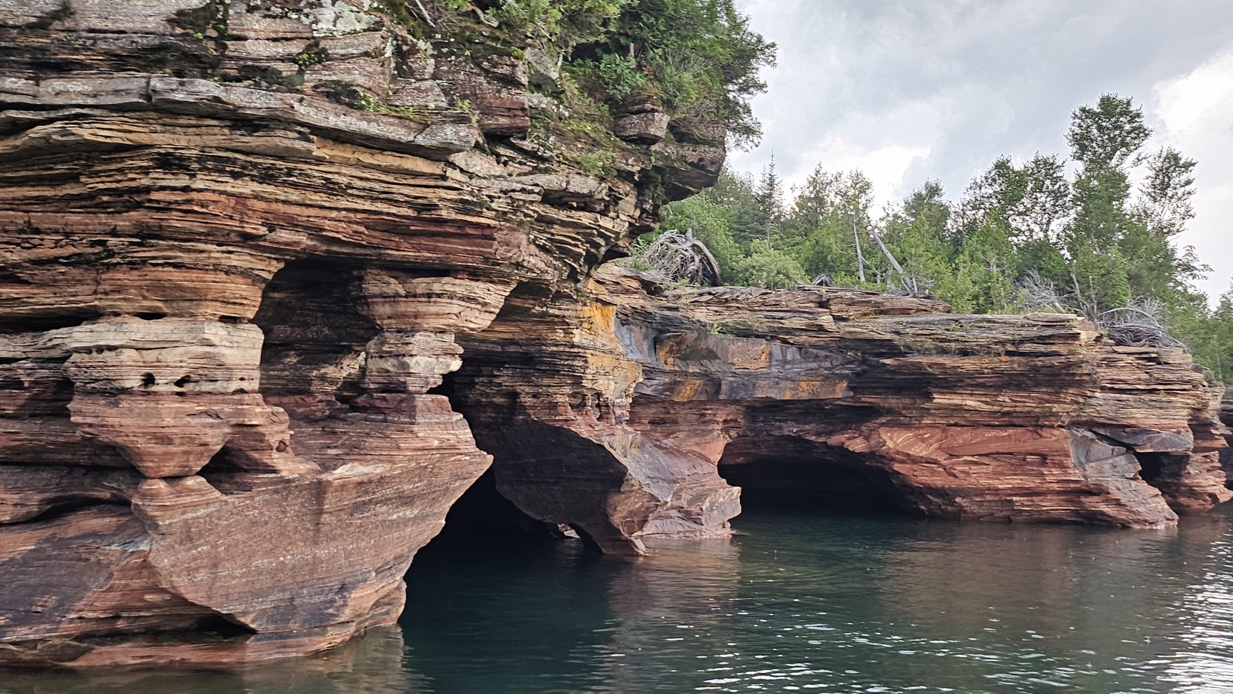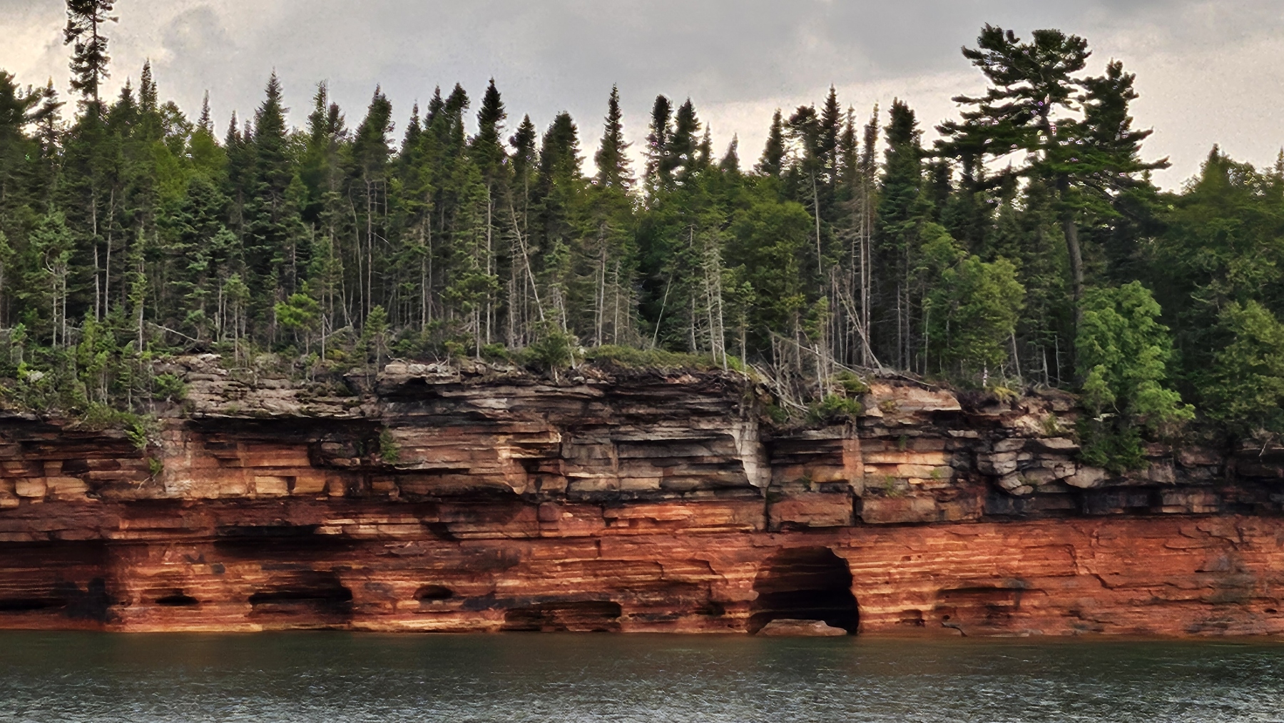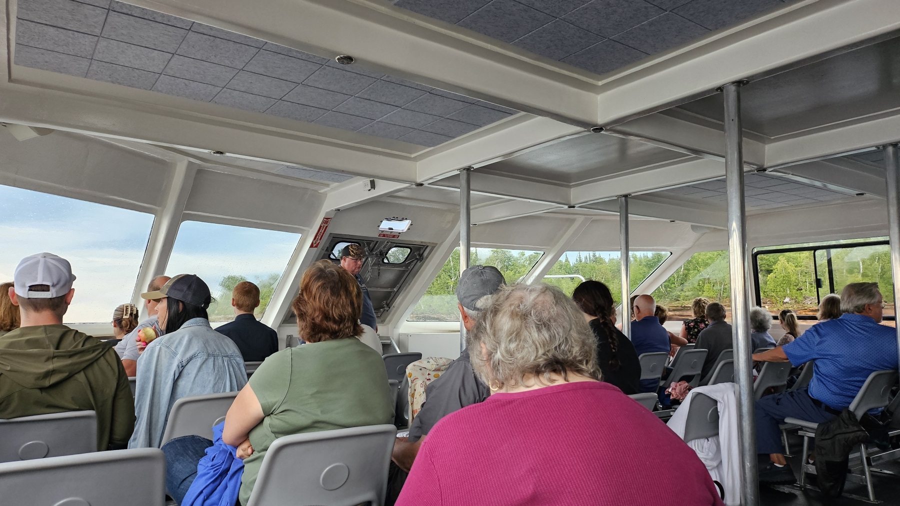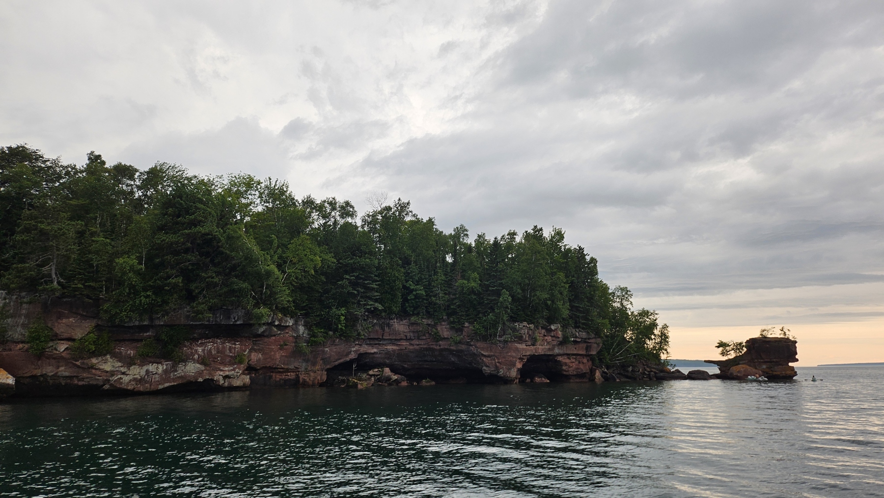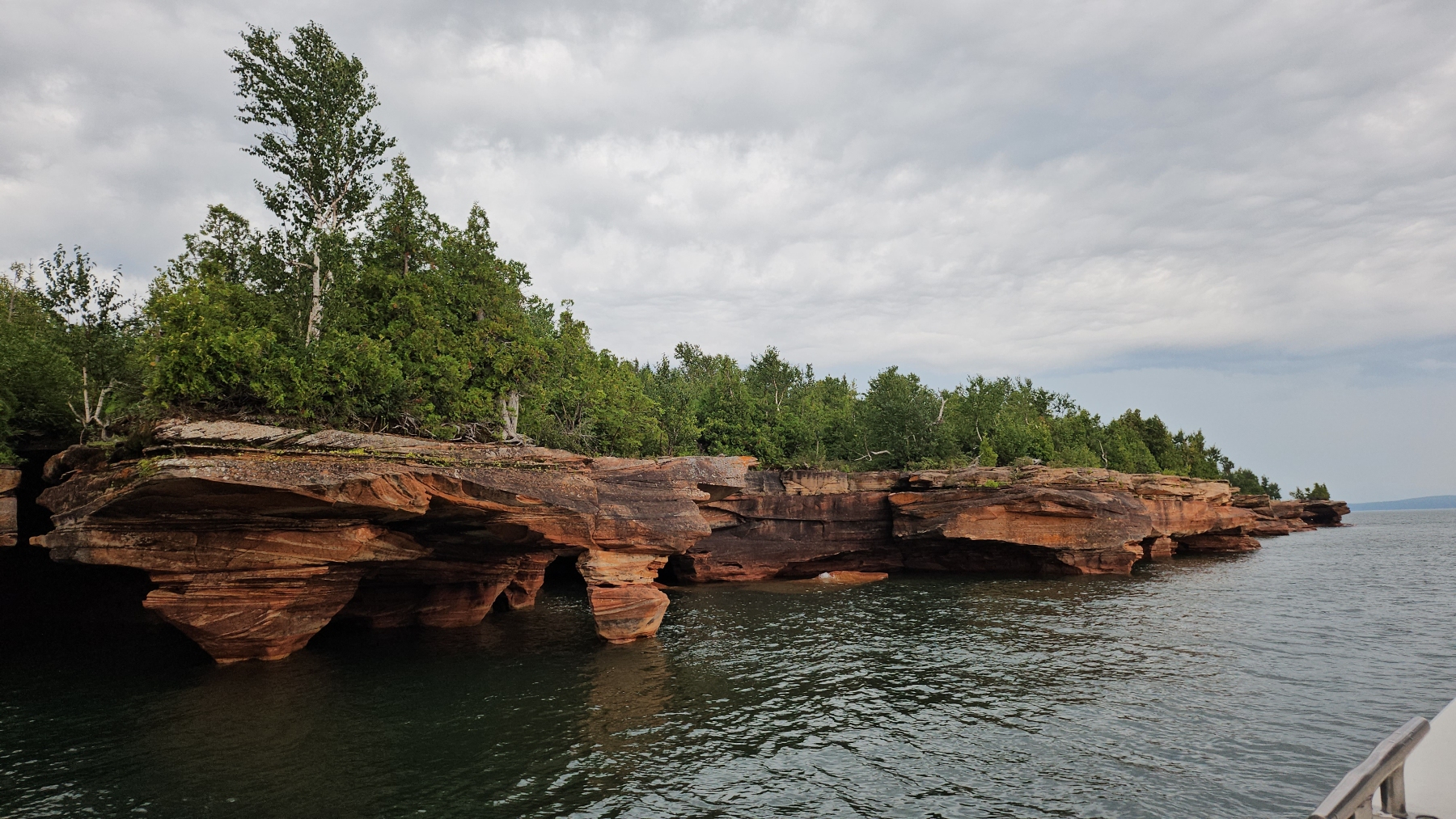 After three reschedules, our Apostle Islands Boat Tour was happening! We got great seats on the big boat and had a great time. Monica read online first that the weather was chilly and potentially rainy on the exposed upper deck, so we got great seats in the enclosed area next to a window that could open and close. After a bit, all of the people who scrambled to get to the upper level were down with us trying to dry off. It was a rainy and chilly trip, but absolutely beautiful.