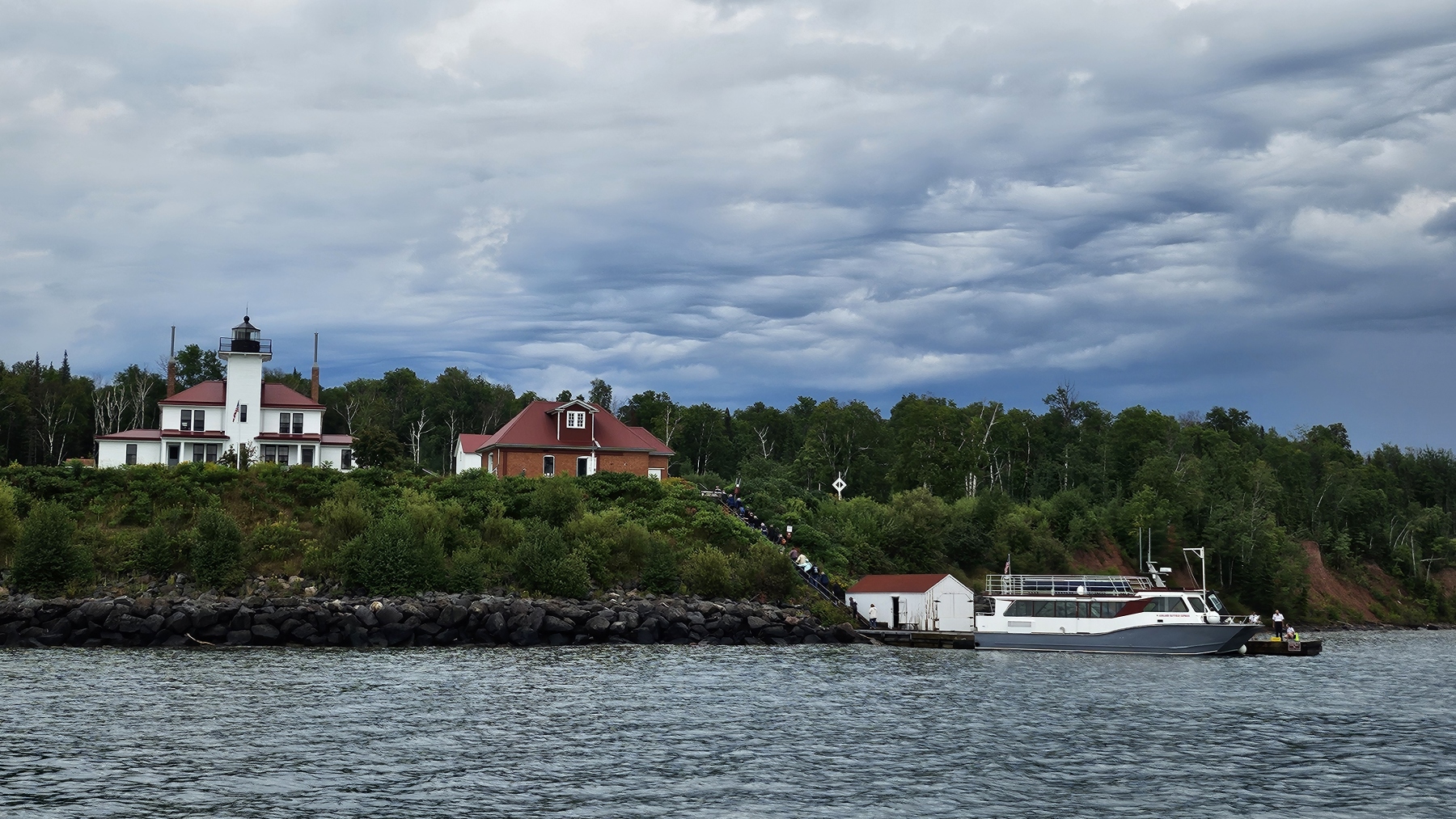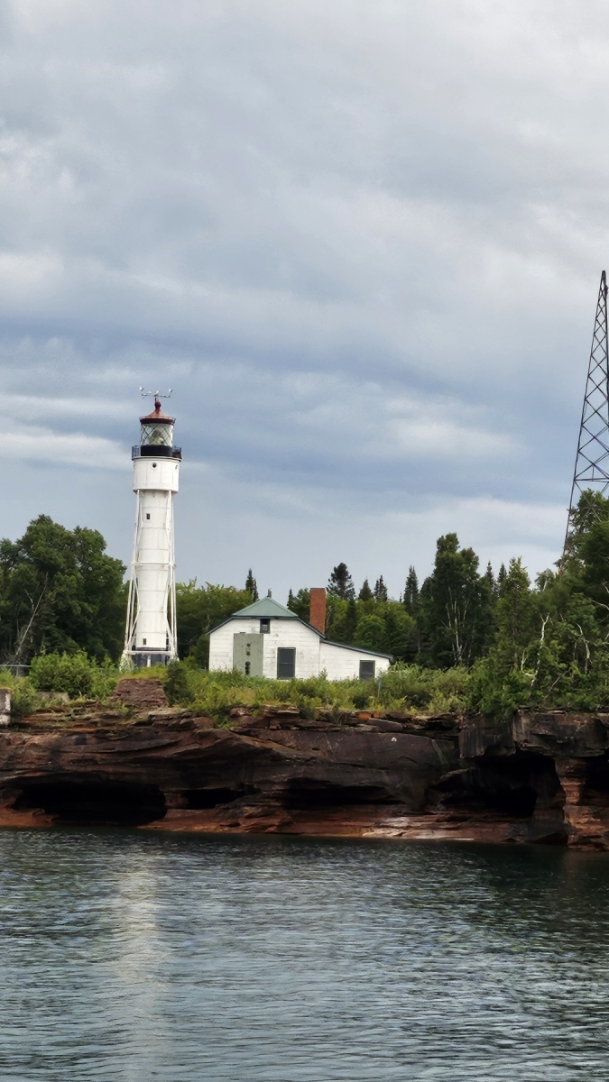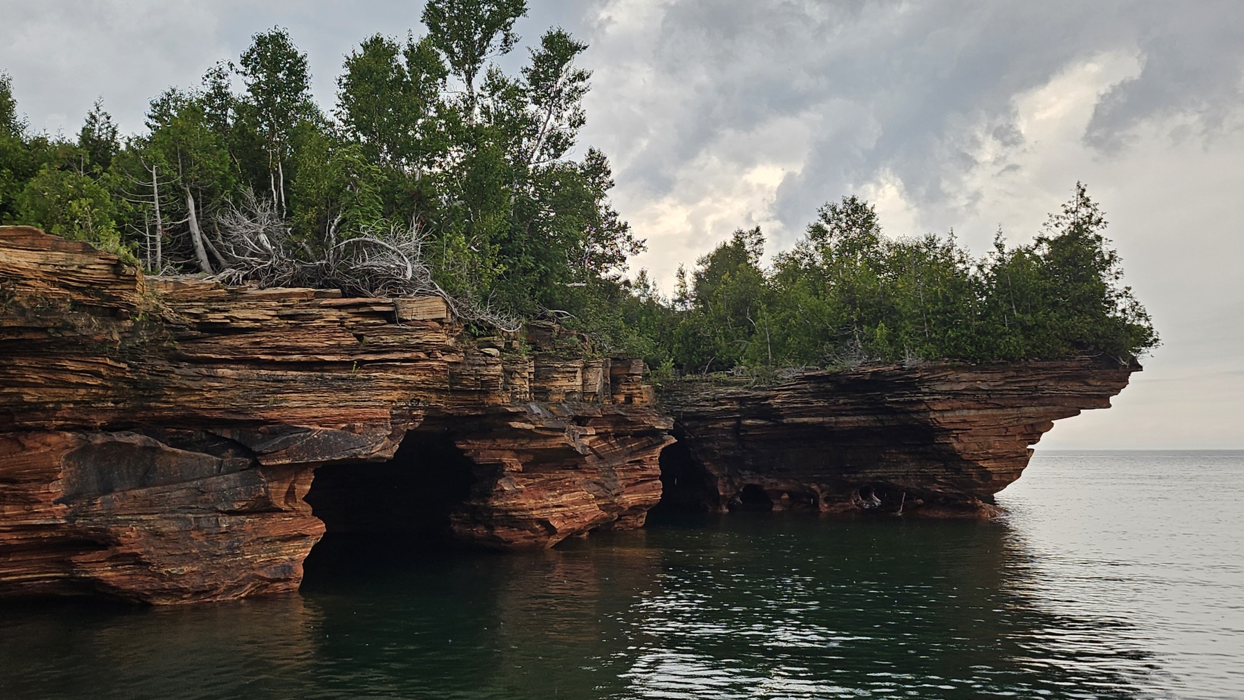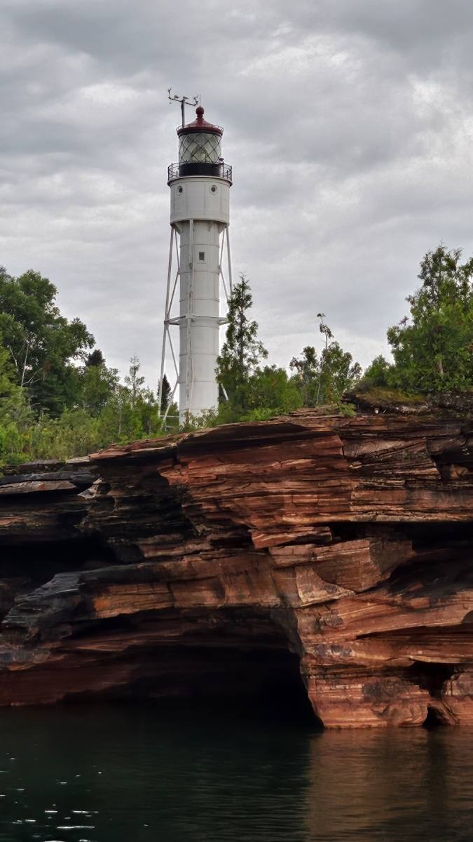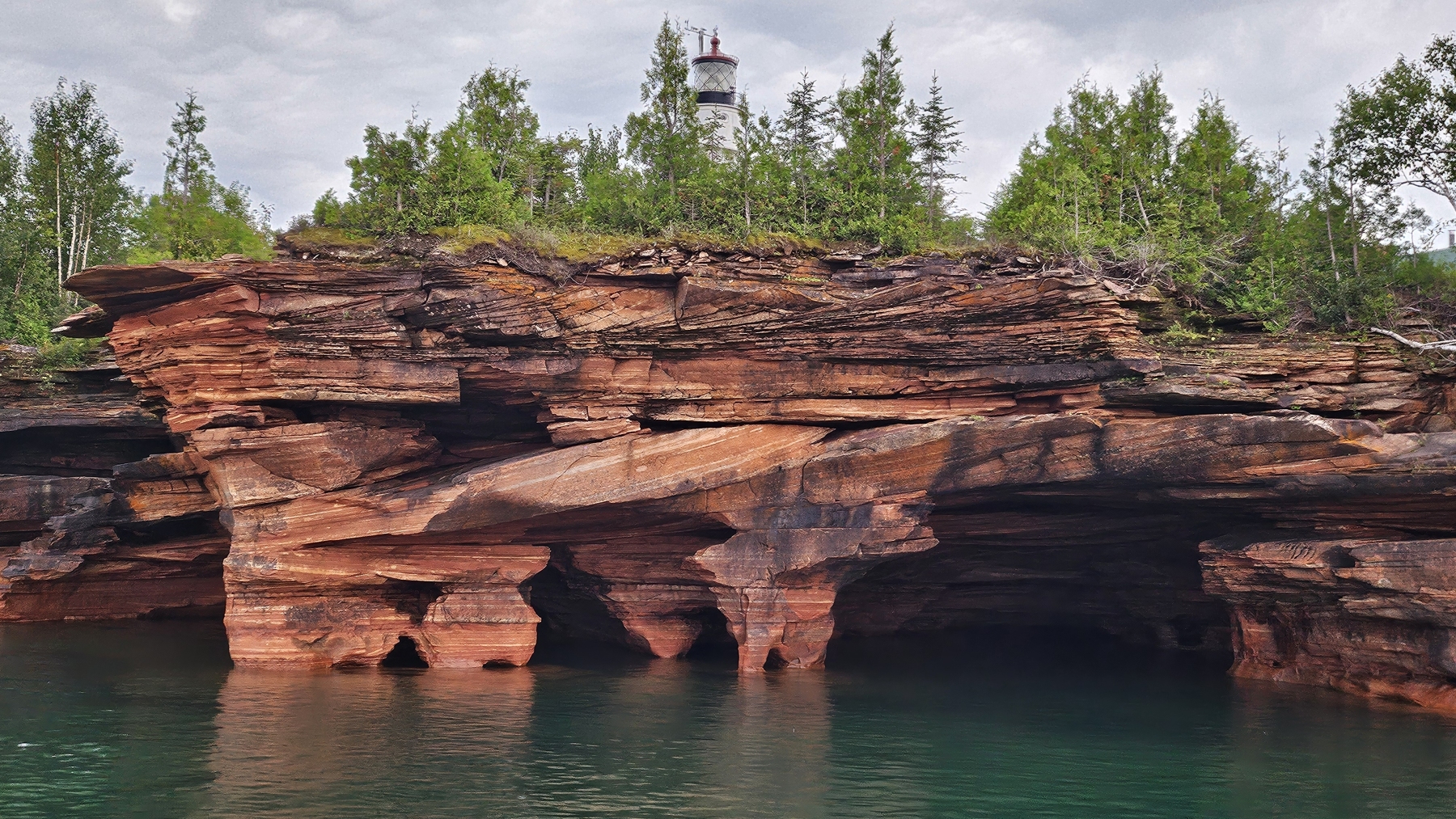 After three reschedules, our Apostle Islands Boat Tour was happening! We got great seats on the big boat and had a great time. Monica read online first that the weather was chilly and potentially rainy on the exposed upper deck, so we got great seats in the enclosed area next to a window that could open and close. After a bit, all of the people who scrambled to get to the upper level were down with us trying to dry off. It was a rainy and chilly trip, but absolutely beautiful.