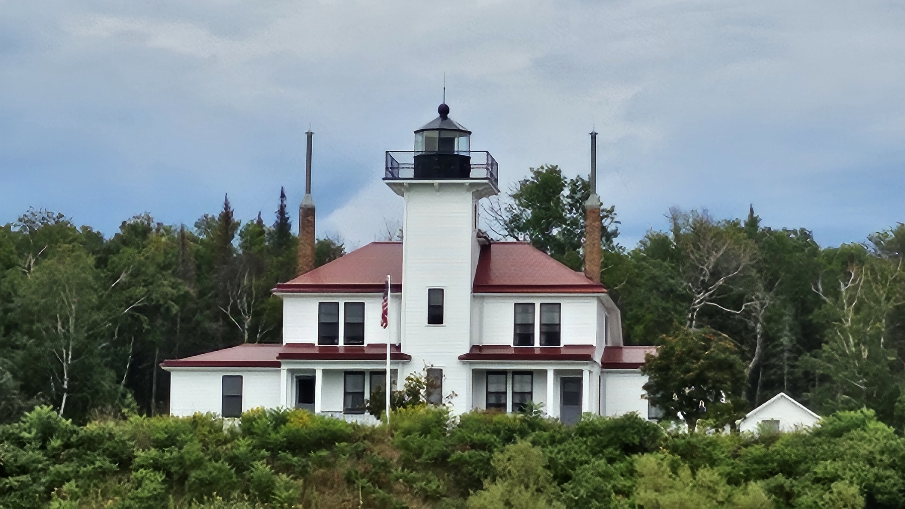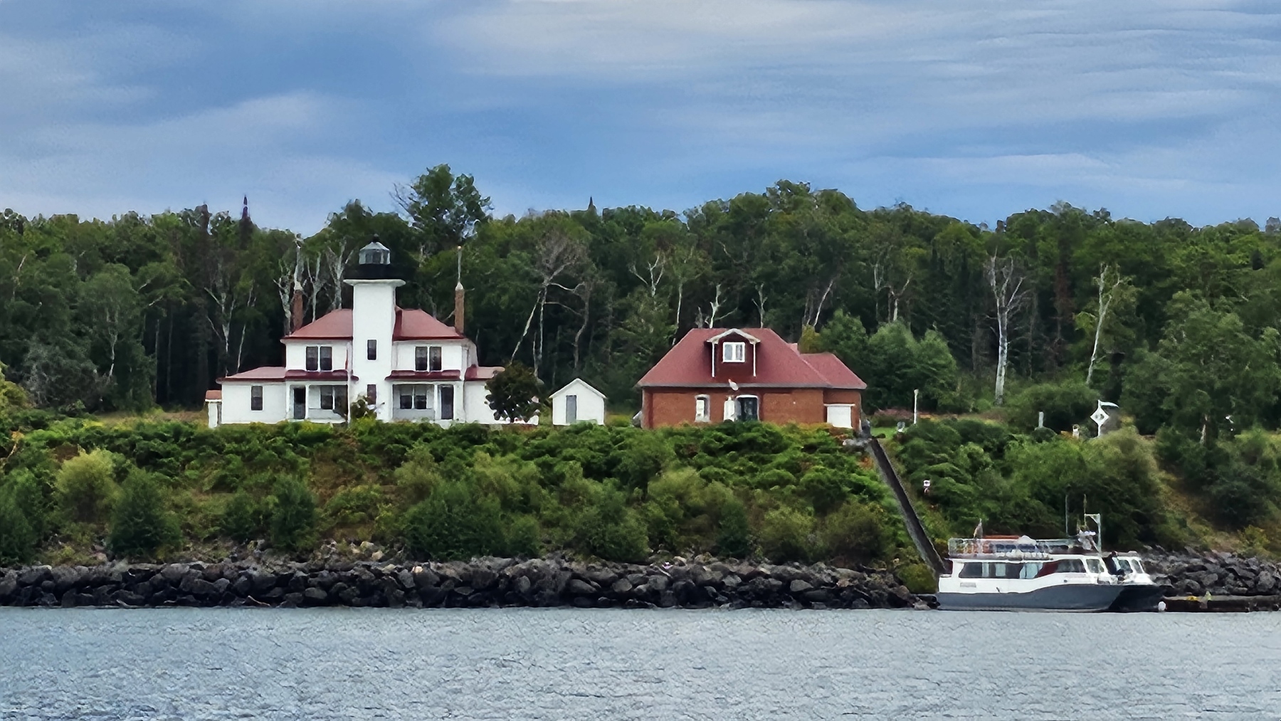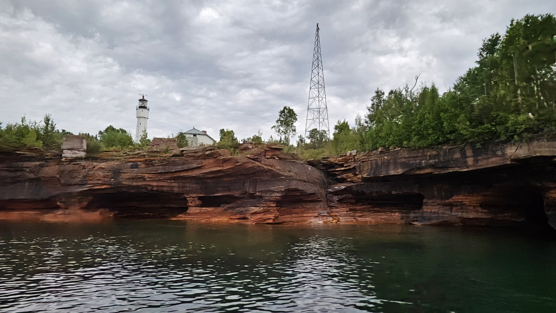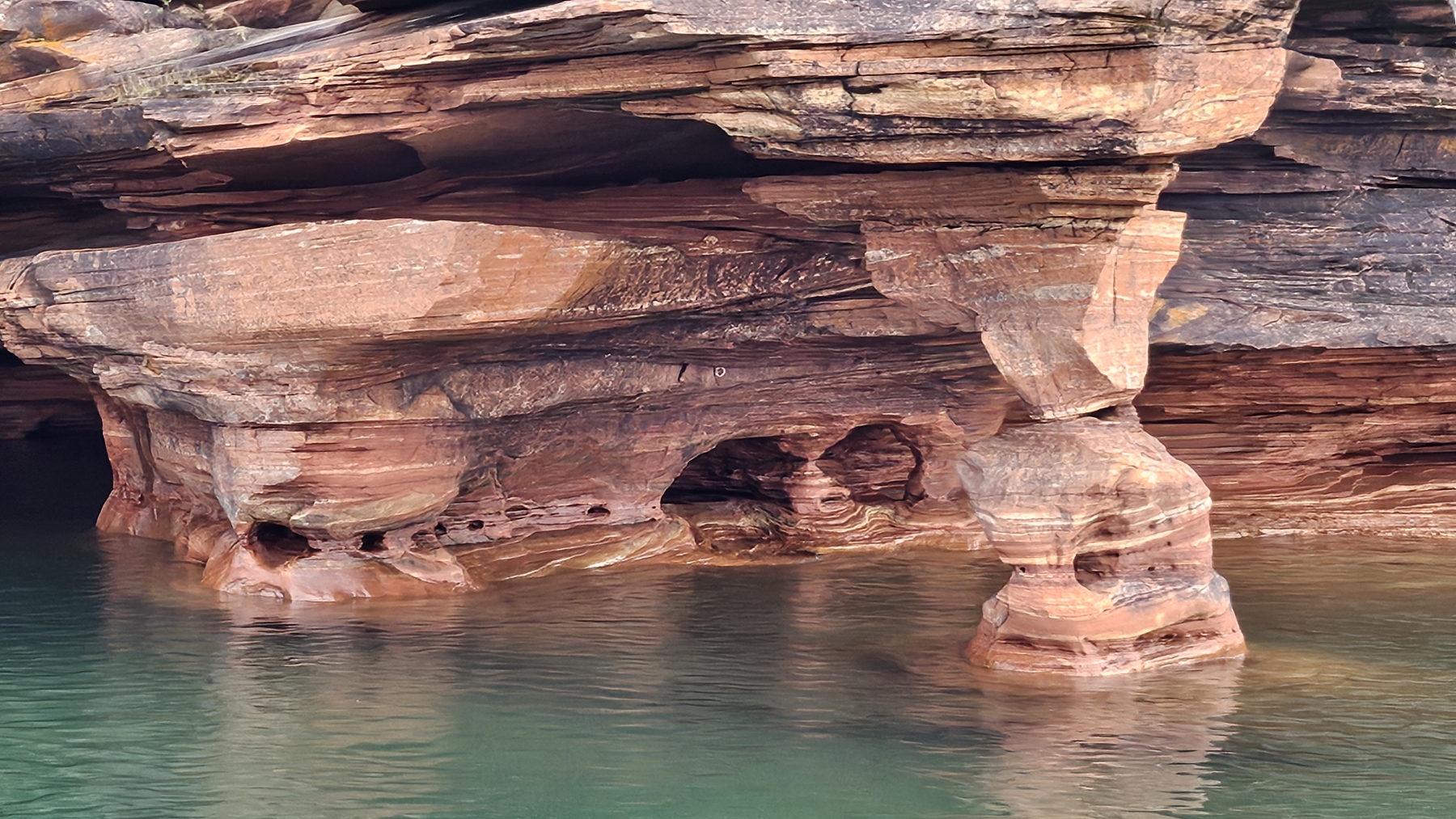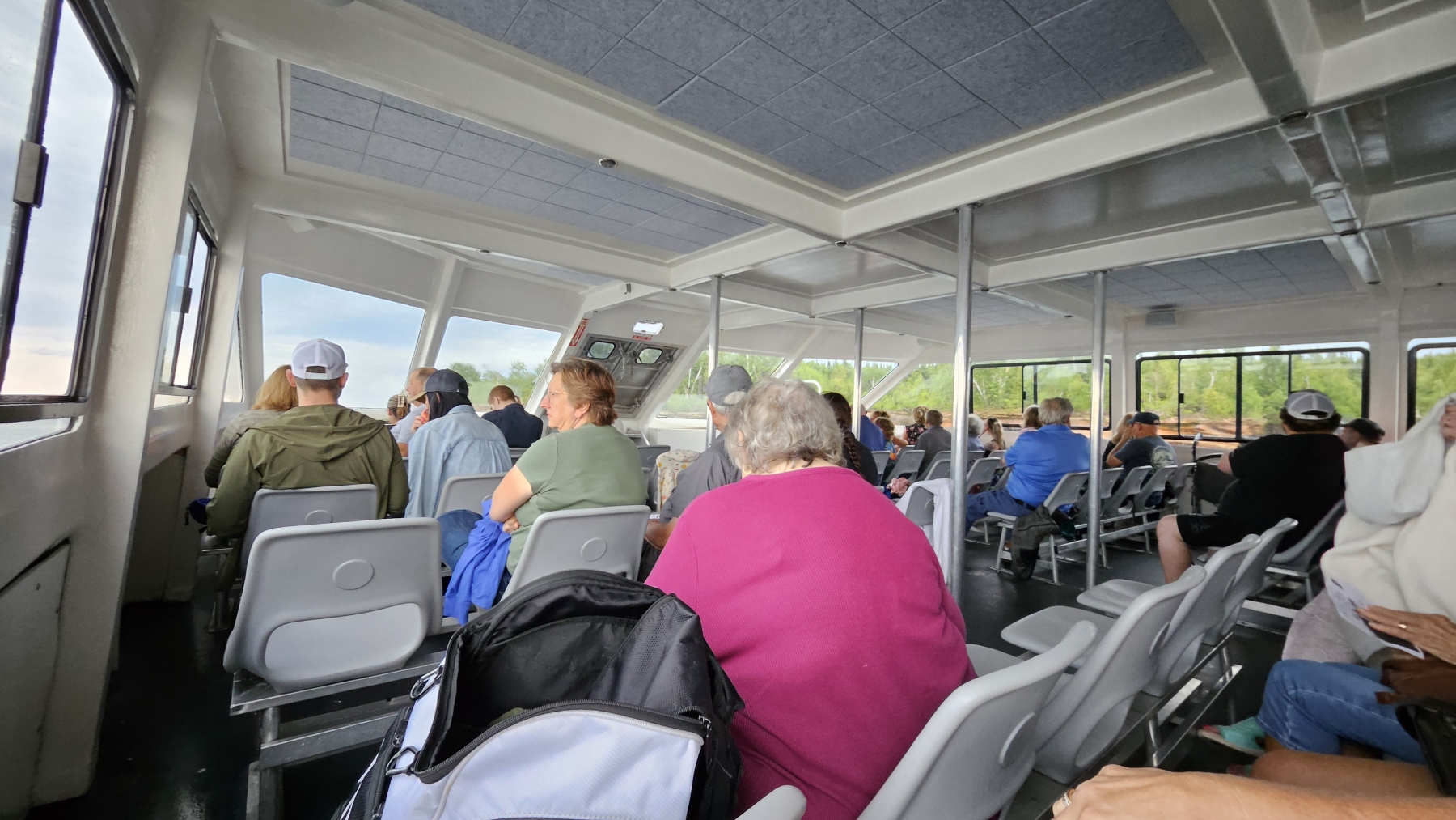 After three reschedules, our Apostle Islands Boat Tour was happening! We got great seats on the big boat and had a great time. Monica read online first that the weather was chilly and potentially rainy on the exposed upper deck, so we got great seats in the enclosed area next to a window that could open and close. After a bit, all of the people who scrambled to get to the upper level were down with us trying to dry off. It was a rainy and chilly trip, but absolutely beautiful.