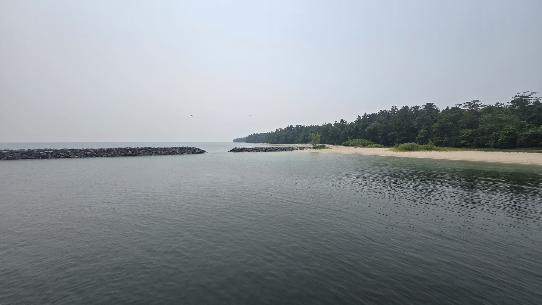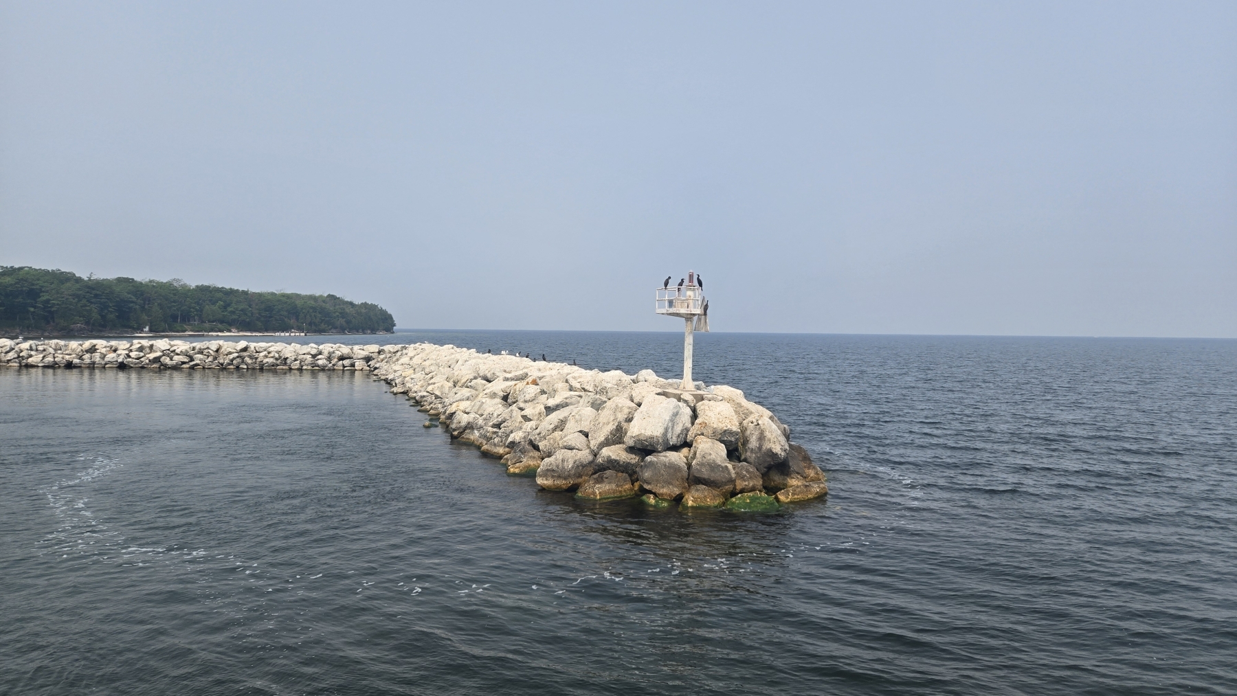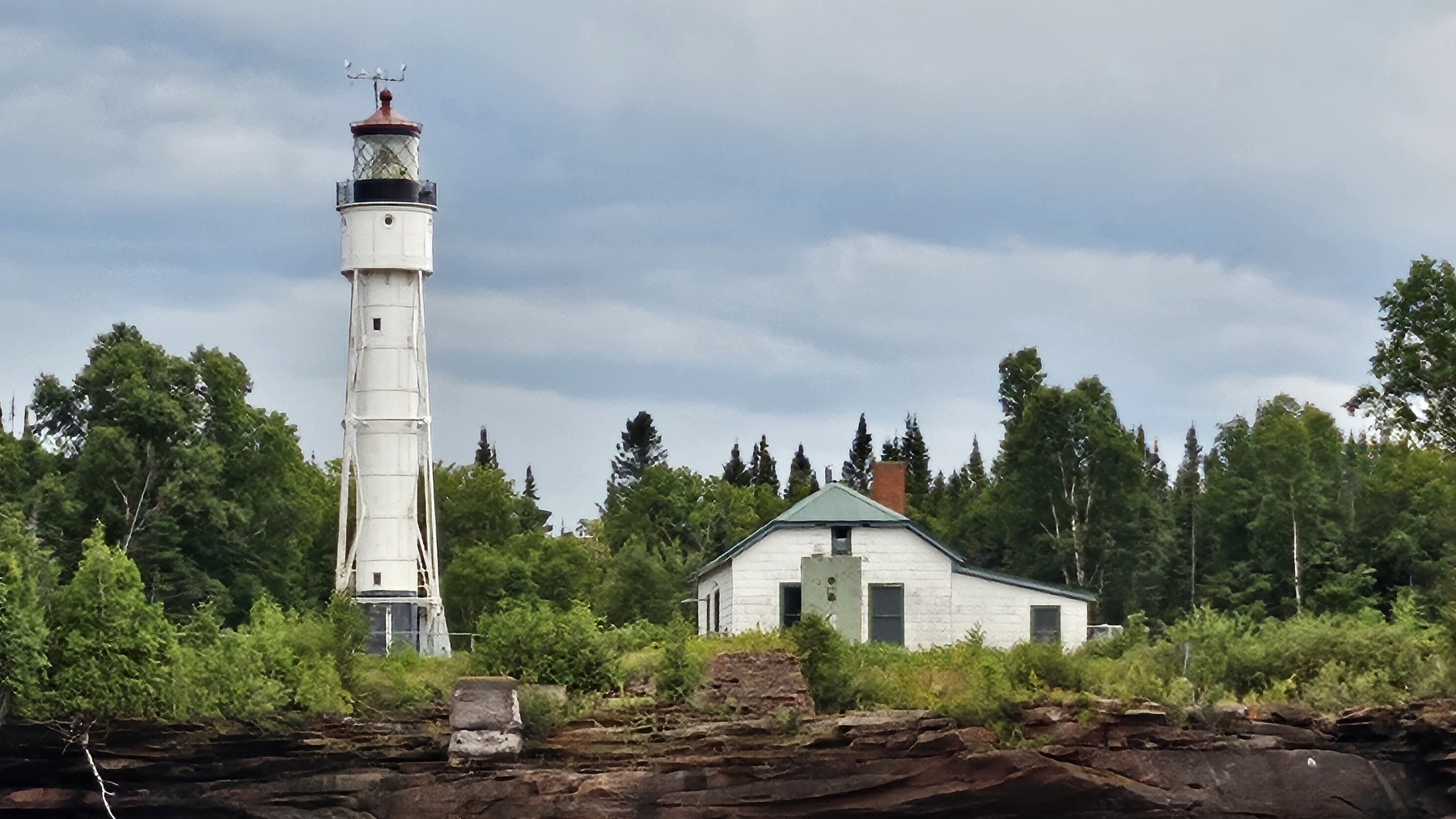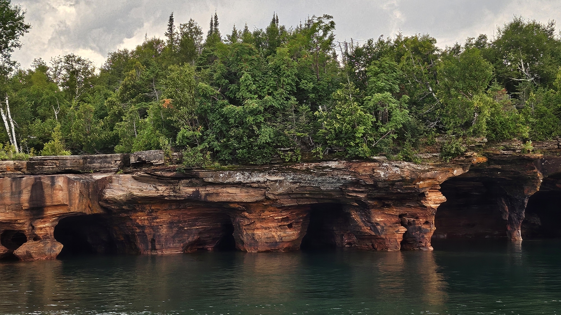 After three reschedules, our Apostle Islands Boat Tour was happening! We got great seats on the big boat and had a great time. Monica read online first that the weather was chilly and potentially rainy on the exposed upper deck, so we got great seats in the enclosed area next to a window that could open and close. After a bit, all of the people who scrambled to get to the upper level were down with us trying to dry off. It was a rainy and chilly trip, but absolutely beautiful.